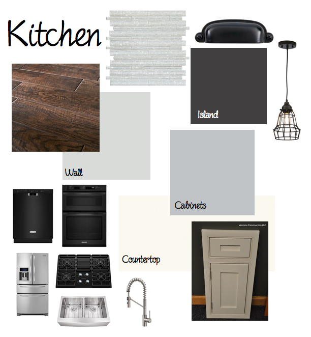 The husband is on board with everything except for the pendant light, he hates it! I have a little while to talk him into it 🙂 Medium grey cabinets, a black island, bright white quartz countertops, inset cabinets, Kitchen Aid appliances, and a shimmery backsplash make up my dream finishes. The faux-wood tile we are putting in is going into the entire first floor of the house, except for the master suite, and will have heating underneath.