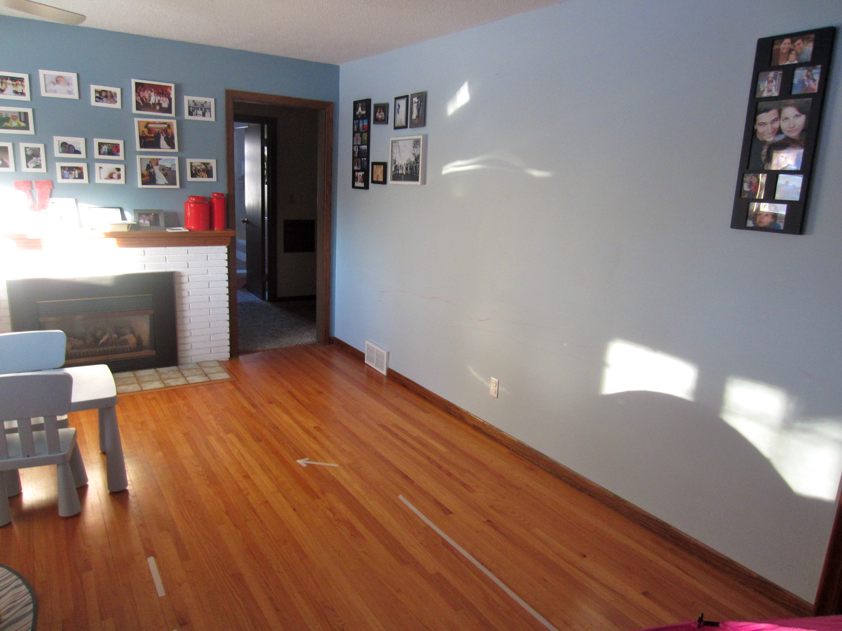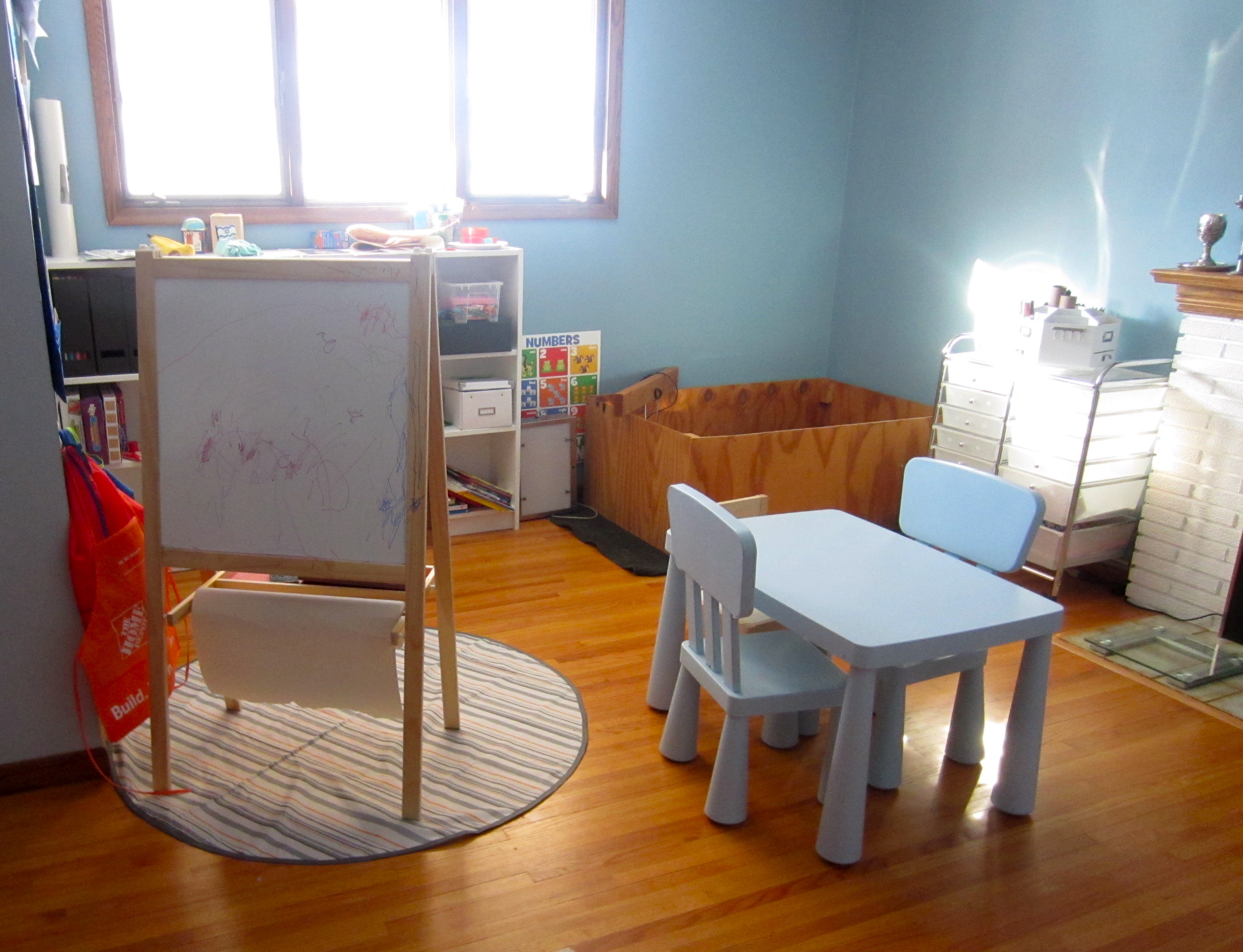 I have this giant bare wall across from the school area. I was going to make it a gallery wall, and started putting pictures up but I don’t like how it looks. My new idea is to use it for more schooling space and possibly add a lego wall, magnet wall, and/or, latch/sensory wall.