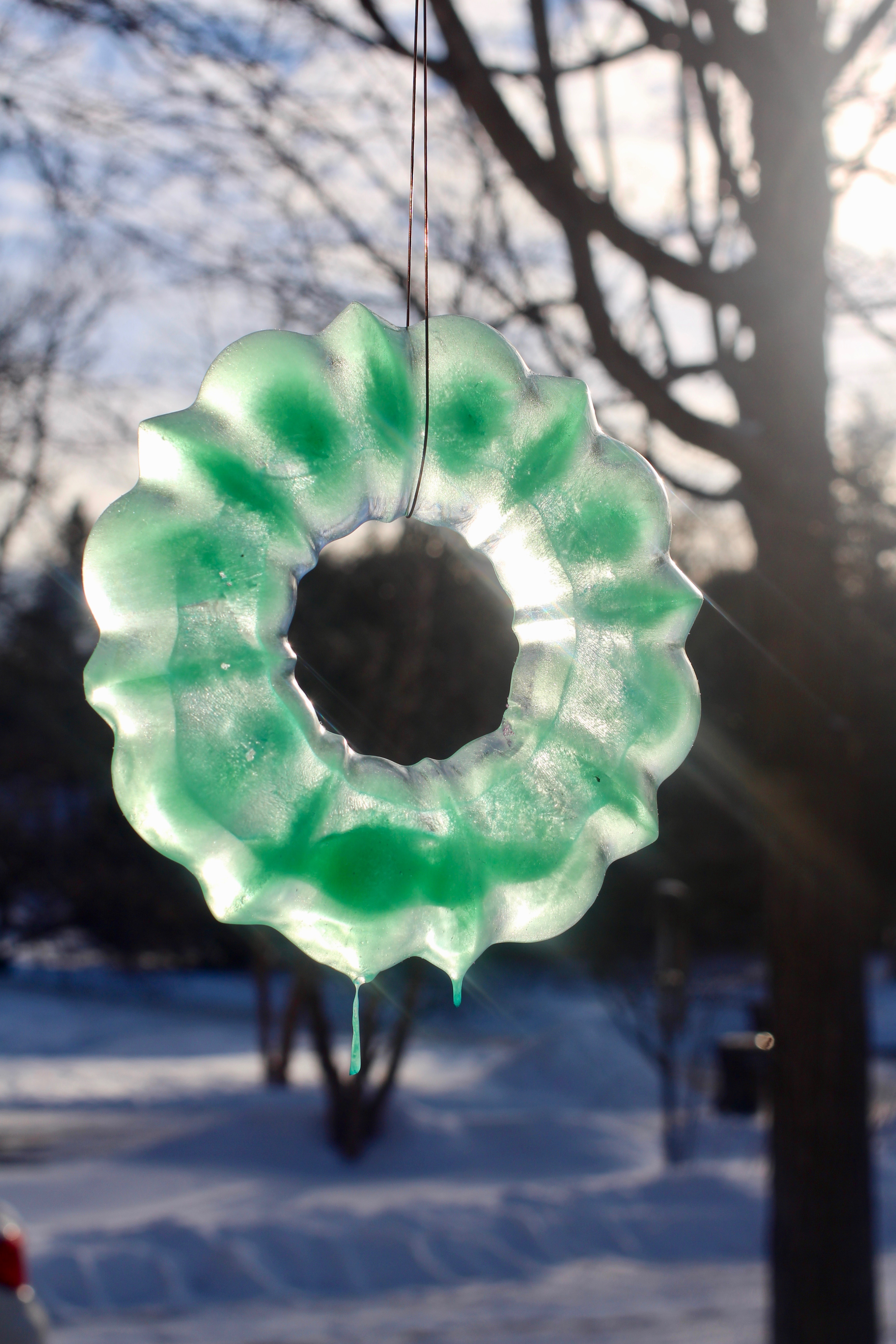 Bundt pans + water + food coloring + glitter = Beautiful hanging ice sculptures.
