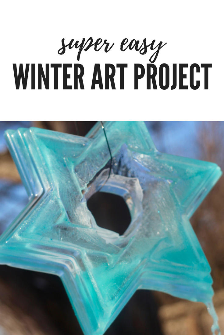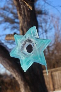 We have a cute circle pan and we also have a super cool Star of David bundt pan. I filled them halfway-ish with water, let the girls pick out the food coloring and glitter and then we put them outside to freeze. After a few hours I brought them in, ran some hot water on the bottom, and popped them out. I tied them up on the porch with some twine and ta-da, cute hanging icicle art.