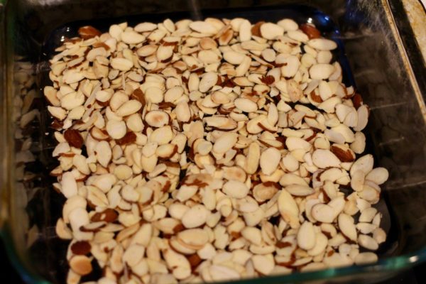 - Preheat the oven to 350 F. Toast almonds in a shallow dish in the oven for 10 minutes. Let cool to room temperature