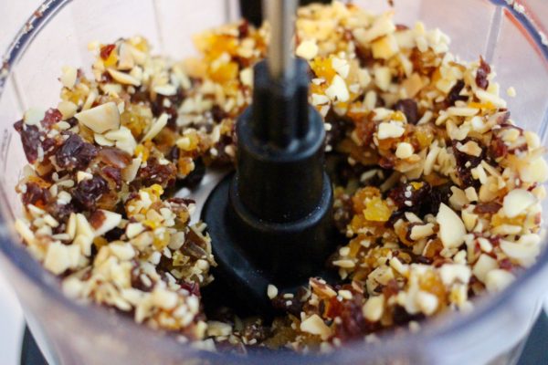- Place almonds, dates, apricots, and cherries in food processor and process until everything is finally chopped but has not yet formed a ball