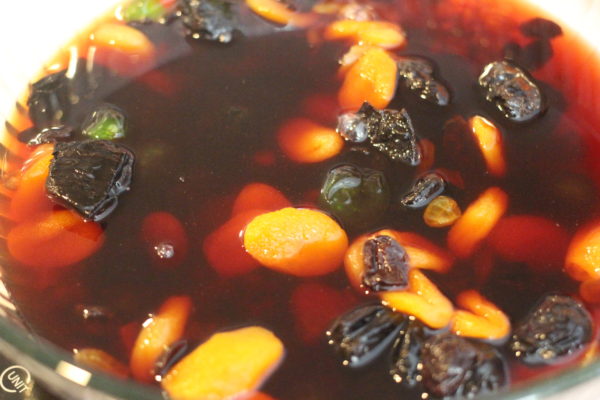1. In a large plastic or glass container with a cover, combine the prunes, raisins, apricots, orange peel, citron, and cherries.Add 1 1/2 cups of the grape juice and the rum, cover, and let stand at room temperature for at least 2 days or up to 3 weeks, shaking the container twice a day.